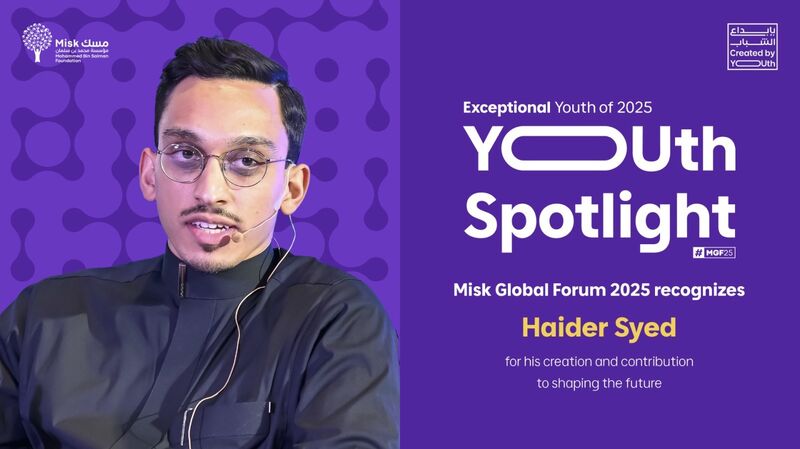 Haider Syed shared that he was honored and recognized by Misk Foundation and Misk Global for his contributions to shaping the future through creativity and innovation in Saudi Arabia, celebrating the impact of young leaders and forward‑thinking initiatives at MGF25.