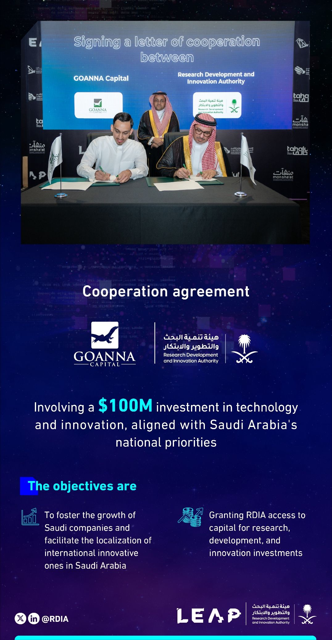 Signed a cooperation letter regarding a $100M commitment to invest in Saudi-focused companies in DeepTech sectors. This strategic initiative will drive innovation and boost the tech landscape in line with the 4 KSA national priorities for Research, Development and Innovation (RDI): Health & Wellness, Sustainable Environment & Supply of Essential Needs, Energy & Industrial Leadership, and Economies of the Future.